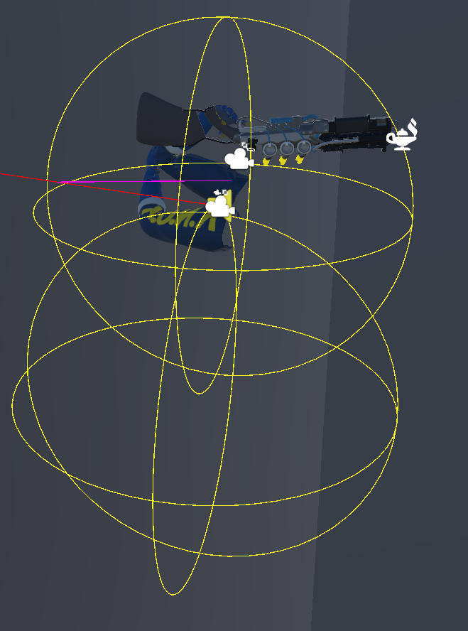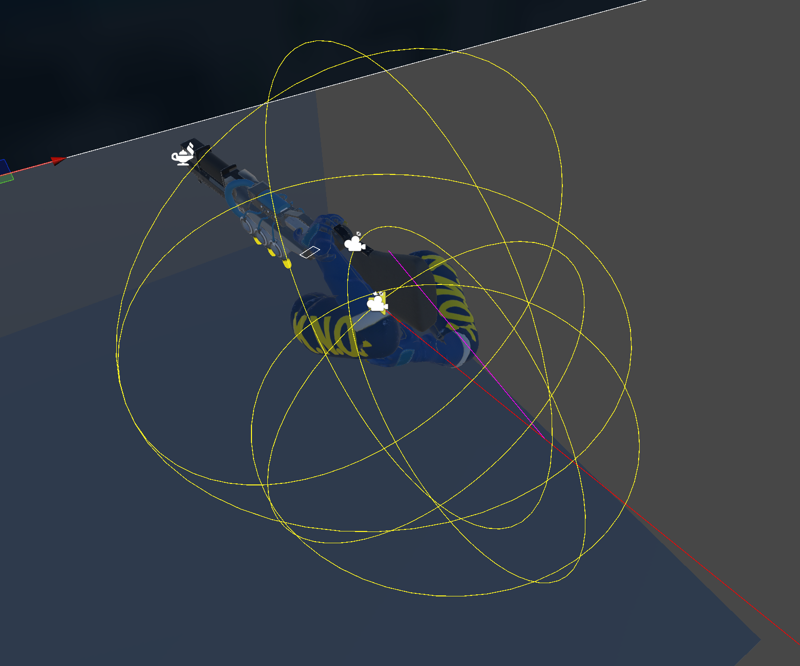 Using Unity’s “raycast” and “overlapping capsule” functions, the code checks to see if the player’s capsule (seen in yellow) has overlapped anything in the current update cycle. If it has, a raycast is drawn in the direction the player is traveling (seen in red). If that raycast hits anything, the player registers a collision and bounces off the surface. By using raycast, the player doesn’t collide with any objects that might be traveling in parallel.