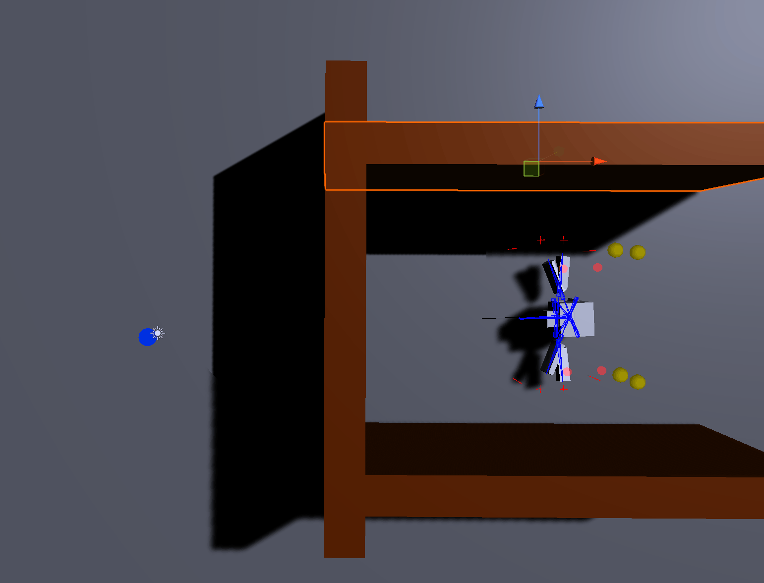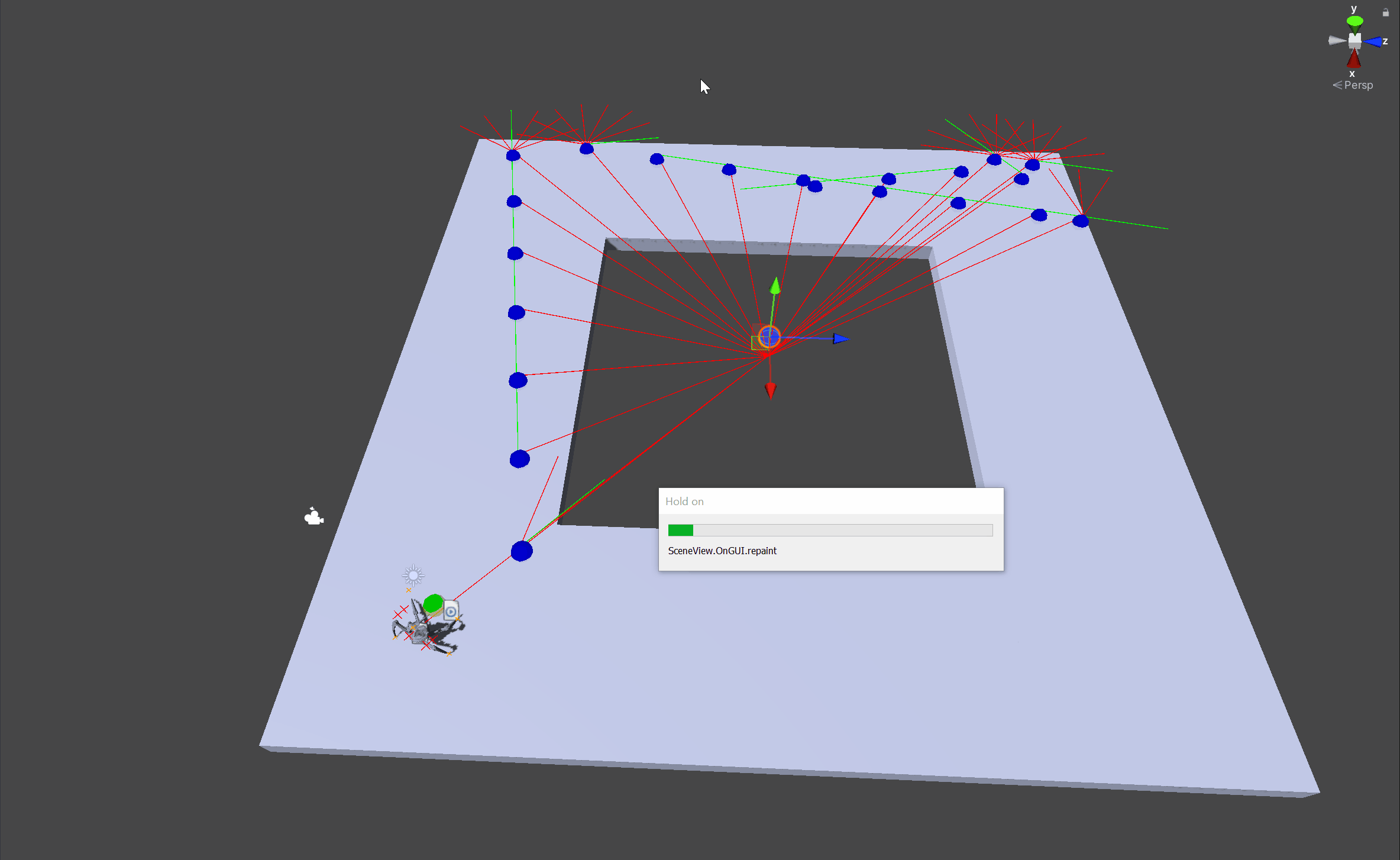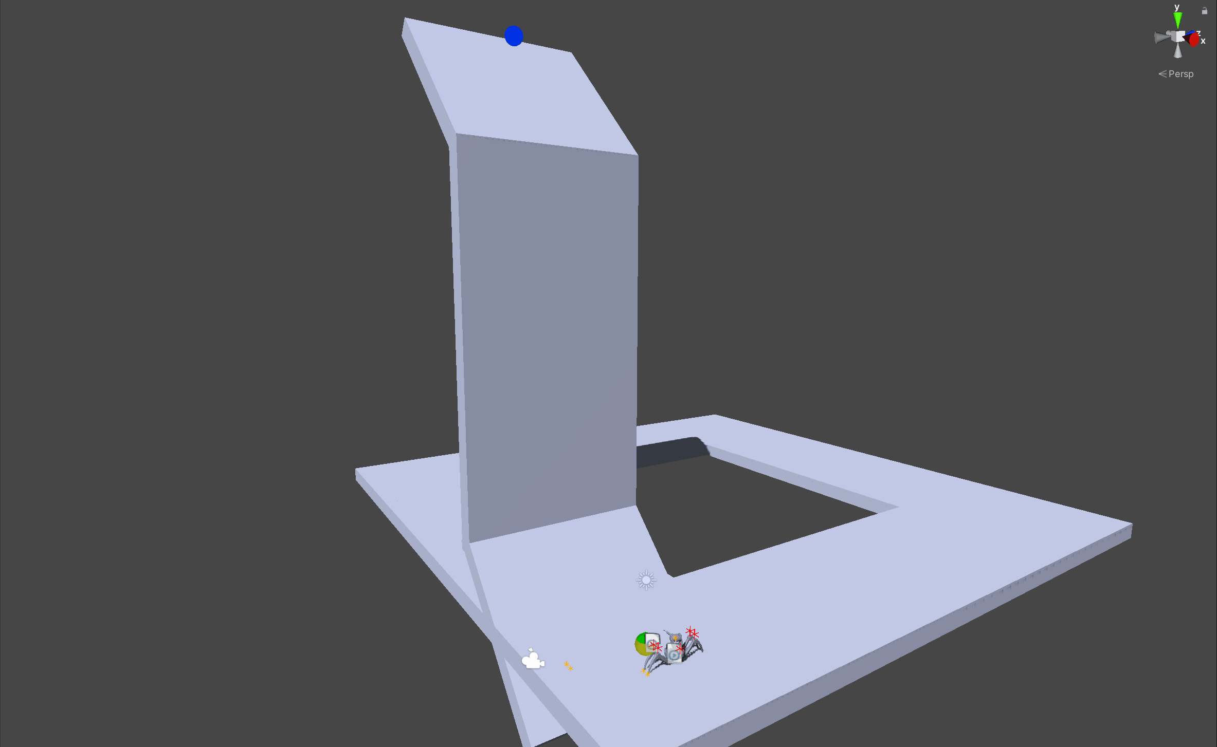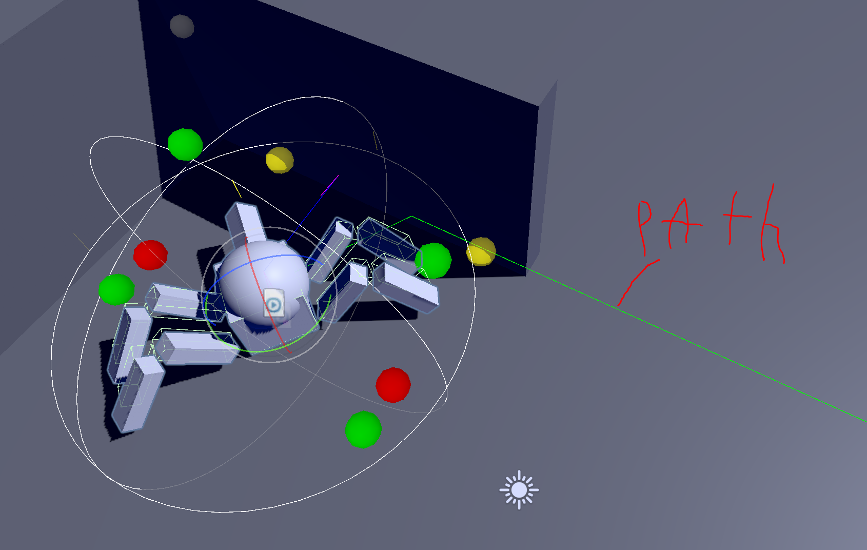 The spider droid’s pathfinding work with two basic functions. The first shoots out a raycast to act as the spider droid’s vision. When the raycast collides with a wall, it takes the normal of that wall face and calculates the angle between the surface the spider is crawling on and the wall the raycast has hit, in order to determine whether or not the wall is climbable. The second function takes the current position of the target object and projects it onto a plane. Building on these two basic functions, I went through three different iterations of the pathfinding algorithm before landing on an algorithm that worked.