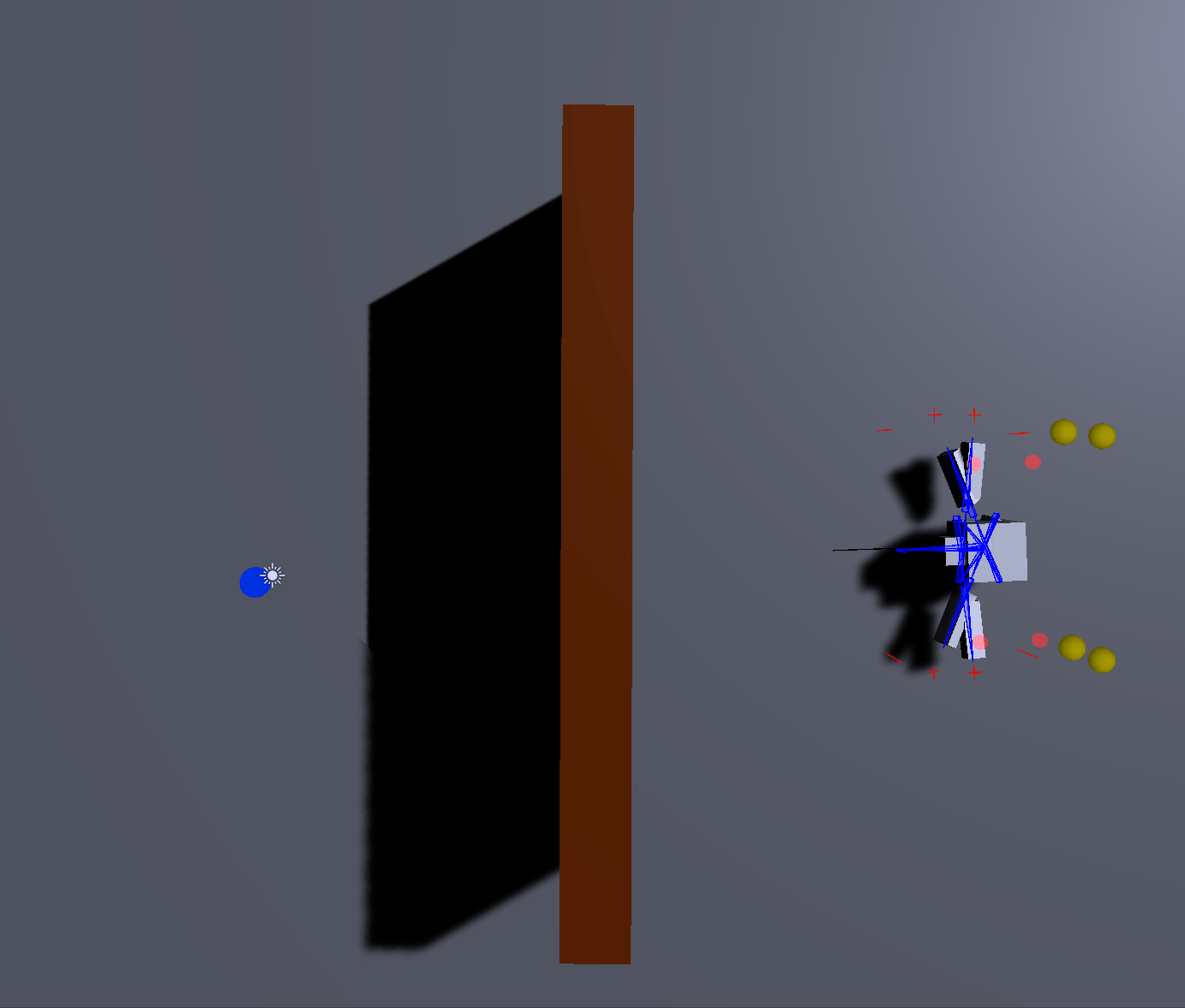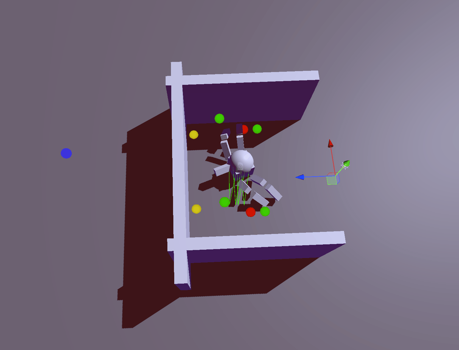 My first approach to pathfinding worked a lot like the Boid movement. The spider droid would generate a number of different directions based on where the target was, where the walls were, and where other spider droids might be. It would assign different weights to each of these directions then take the average direction to move in.
